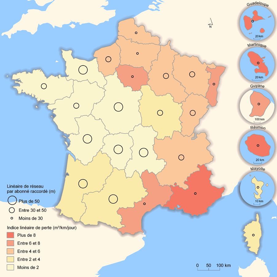 Le réseau de distribution d’eau potable est constitué de conduites de différents diamètres. Le vieillissement, les mouvements de terrains ou autres phénomènes naturels ou non, peuvent causer des fuites sur ce réseau. Le volume des pertes est estimé à 1,3 milliard de m3, soit 22% de la production en 2008. Celles-ci représentaient plus de 3,5 m3 par jour et par km de canalisation en 2008. Le volume des pertes diminue cependant de façon importante d’année en année. En 2004, ce volume était de 1,5 milliard de m3, soit près de 24% de la production en 2004. Cette diminution des fuites s’explique essentiellement par le renouvellement et le développement des canalisations et par de possibles progrès dans le dispositif de surveillance, par exemple la détection/réparation plus rapide des fuites.